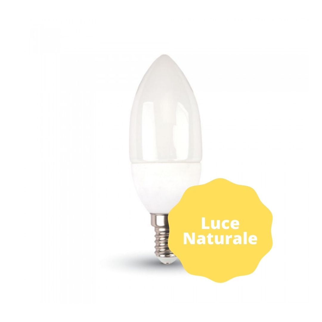 Lampadina LED V-Tac VT-1855 con potenza di 5,5W e attacco E14. Forma Candela in materiale termoplastico bianco con copertura opaca. LED SMD con fascio luminoso di 200°, flusso luminoso di 470 lm e rapporto di 85 lm/W. La potenza di 5,5W è equivalente a 40W di una lampadina ad incandescenza.