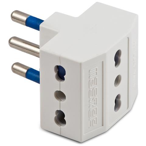 Master Adattatore Triplo con spina da 16A. Questo adattatore triplo in materiale plastico di colore bianco, ha spina di tipo Italiano 2P+T 16A e 3 prese bivalenti 10/16A 2P+T.
