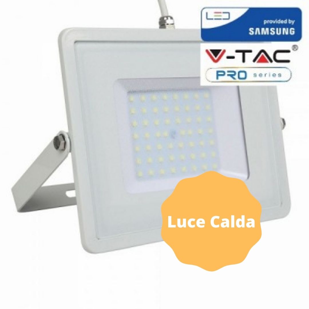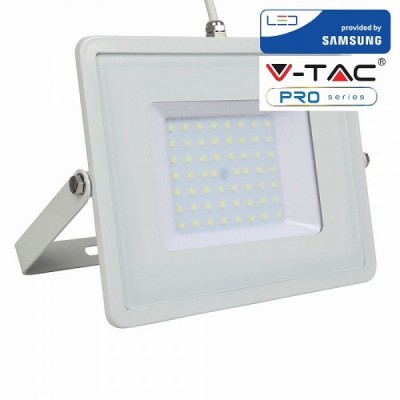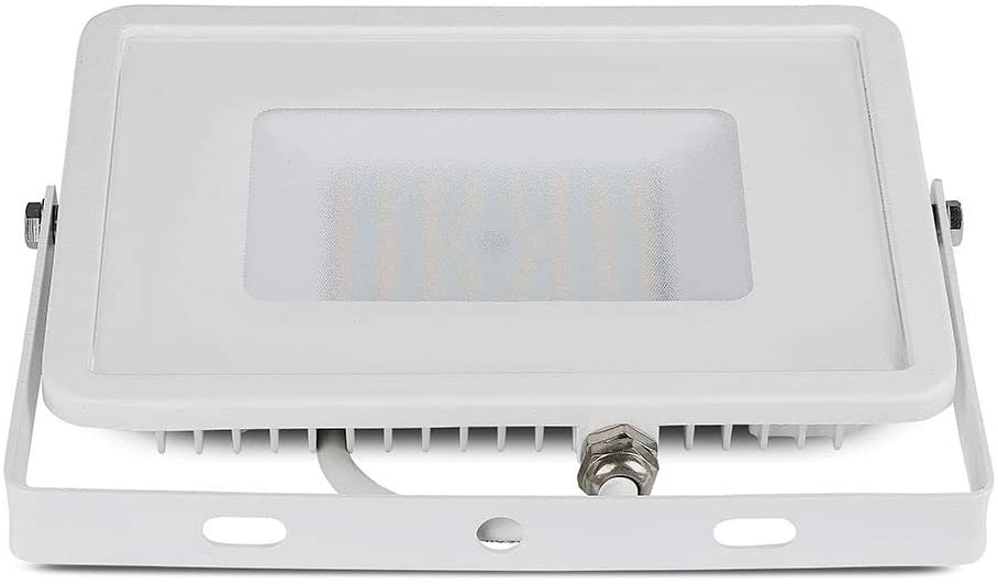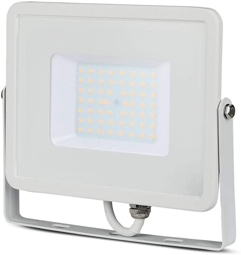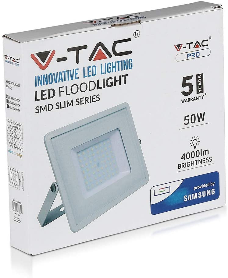 Faro LED V-Tac PRO VT-50 con potenza di 50W. Corpo ultra sottile in alluminio pressofuso di colore bianco con staffa e cavo di colore bianco e copertura in vetro trasparante. Proiettore con tecnologia LED SMD adatto all’uso esterno, grado di protezione IP65. Fascio luminoso di 100°, flusso luminoso di 4000 lm e rapporto di 80 lm/W. Il design slim, lo rende più leggero di un normale faro e più semplice da installare, oltre ad avere un’estetica più accattivante.