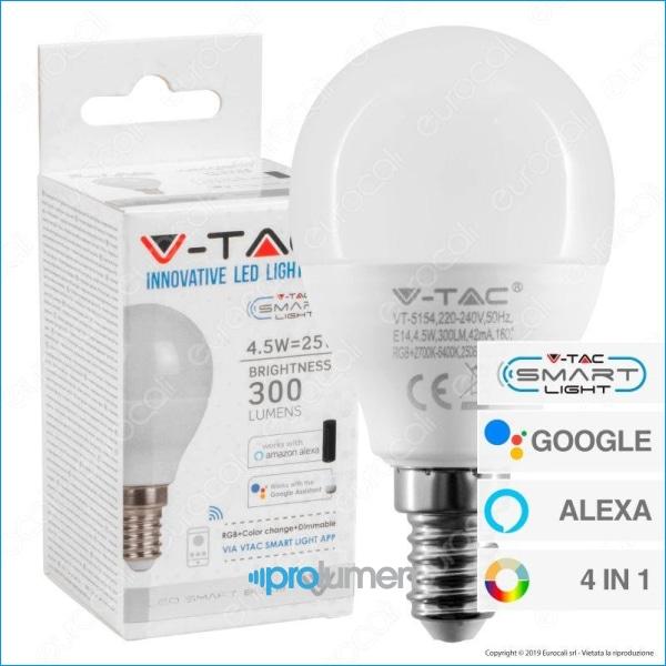 V-Tac VT-5154 Lampadina LED Smart RGB+W 4in1 dimmerabile con potenza di 5W e attacco E14. Forma MiniGlobo P45 in materiale termoplastico bianco. LED SMD con fascio luminoso di 180°, flusso luminoso di 300 lm e rapporto di 66 lm/W. Questa particolare lampadina si distingue per la possibilità di controllarla tramite smartphone, sfruttando la rete Wi-Fi di casa da 2,4Ghz. Tramite apposita App V-Tac Smart Light (per iOS e Android) è possibile interagire con uno o più dispositivi connessi, con la possibilità di creare anche gruppi di lampadine: utile per esempio per controllare le luci delle varie stanze della propria casa.