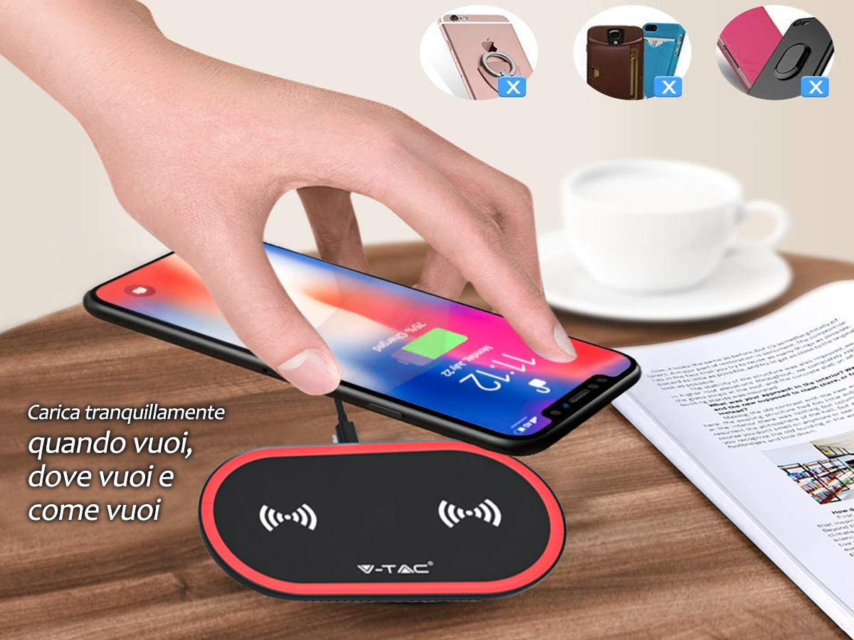 V-Tac VT-1213 caricatore wireless con potenza di 10W (2x 5W). Di dimensioni compatte e realizzato in materiale plastico di colore nero, con piedini in gomma antiscivolo per appoggiarlo su qualunque superficie piana. Si caratterizza per la presenza di due postazioni di ricarica wireless, una a destra e una a sinistra, con potenza di 5W ciascuna, che permettono di ricaricare due dispositivi contemporaneamente. Ciascuna postazione presenta un LED di stato: in colore rosso indica lo stato di ricarica in corso, mentre in verde indica il termine della ricarica.